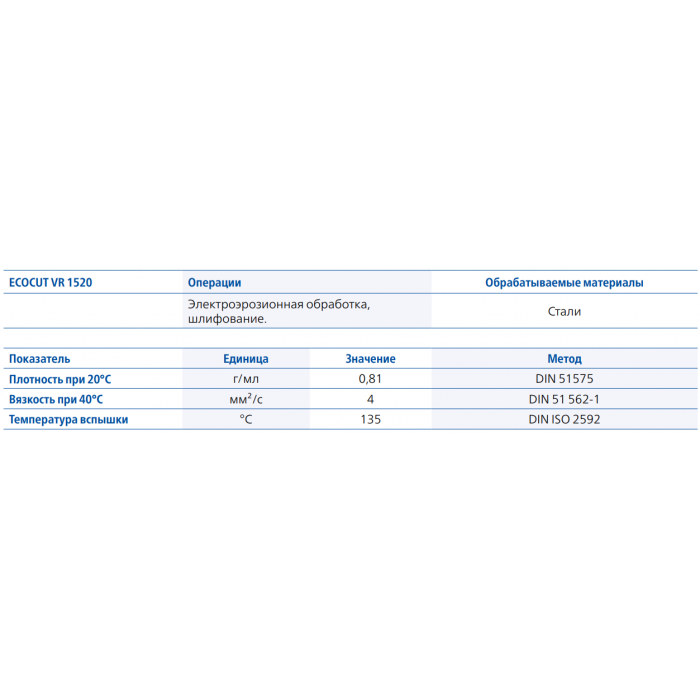 ECOCUT VR 1520 - низковязкая масляная СОЖ для шлифования и электроэрозионной обработки ECOCUT VR 1520 – это маловязкое масло, не содержащее ароматических углеводородов. За счет очень узкого интервала кипения ECOCUT VR 1520 почти не образует дыма. Продукт не оказывает вредного воздействия на кожу.